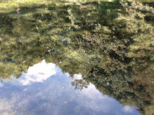 この日の富士山は青空に浮かぶ雲の向こうでしたが、水面に映る光景に、その姿へ思いを巡らせます。